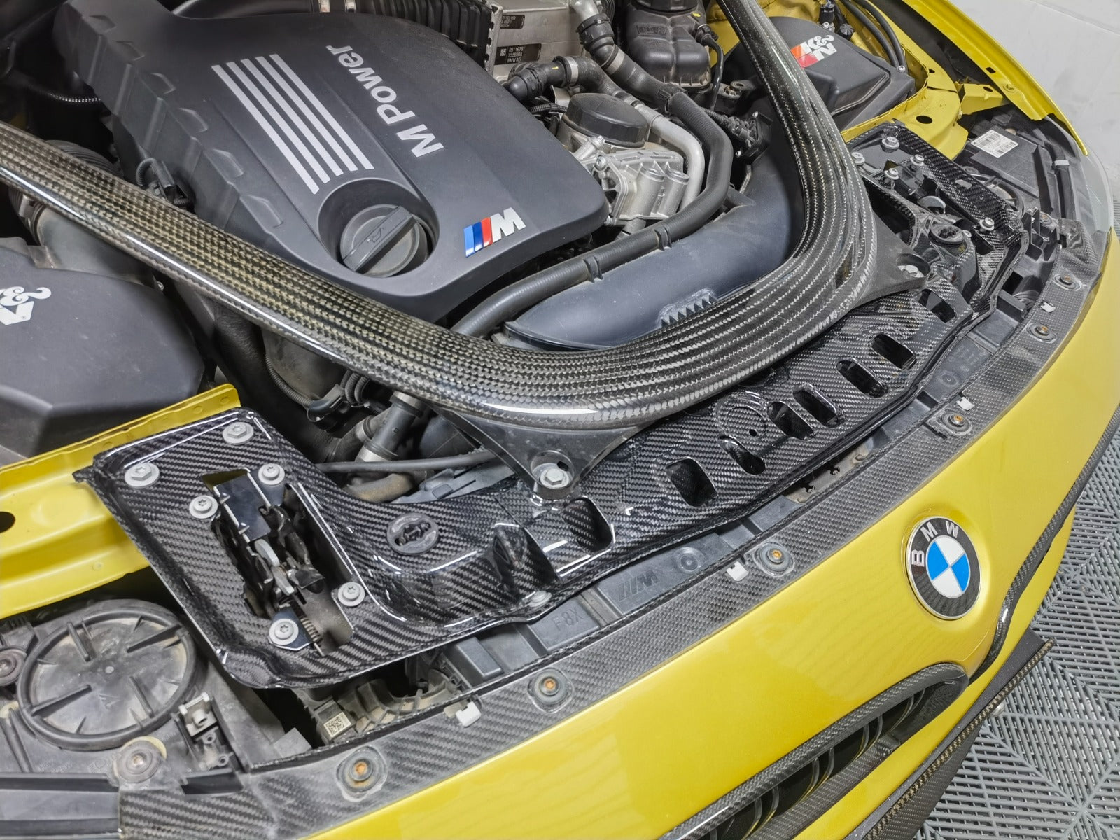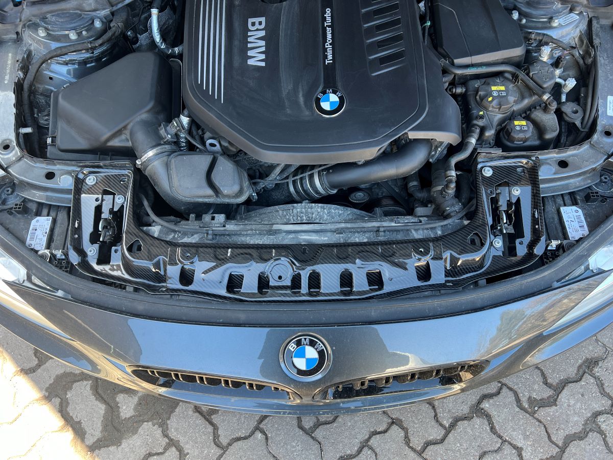 This tie bar is made entirely from dry carbon fiber (prepreg), making it 2.5kg (or 5.5lbs) lighter than your original BMW black metal tie bar. Its shape mirrors that of your original black metal upper tie bar.